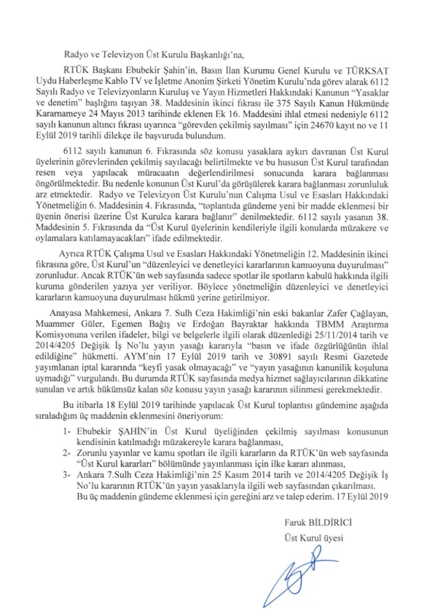 Faruk Bildirici, RTÜK'teyken verdiği bu dilekçeleri birçok kez ısrarla Üst Kurul toplantılarında da dile getirdi.