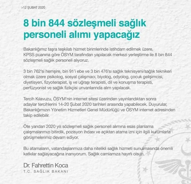 Açıklamada, "Bakanlığın taşra teşkilatı hizmet birimlerinde istihdam edilmek üzere, KPSS puanına göre ÖSYM tarafından yapılacak merkezi yerleştirme ile 8 bin 844 sözleşmeli sağlık personeli alıyoruz." bilgisini veren Koca, şunları kaydetti: