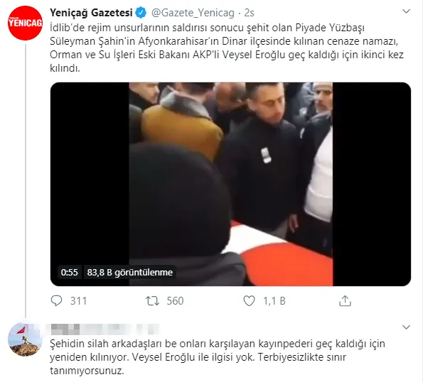 İdlib’de şehit olan kahraman askerimiz Piyade Yüzbaşı Süleyman Şahin’in cenaze törenine katılan İYİ Partili Aylin Cesur’un cemaatin önüne geçerek poz vermesi büyük tepki çekerken partinin gazetesi olarak bilinen Yeniçağ gazetesi skandalı örtmek için yalan haber yaptı. Yeniçağ gazetesi, İYİ Partili Aylin Cesur’u korumak için namaz üzerinden algı operasyonu yaptı. Cenaze namazının AK Partili Veysel Eroğlu nedeniyle ikinci kez kılındığı yalanını söyleyen Yeniçağ gazetesinin manipülasyonu kısa süre içerisinde ortaya çıktı. Namazın ikinci kez kılınmasının sebebinin şehidin geç kalan silah arkadaşları ve kayınpederi olduğu söylendi.
