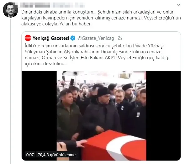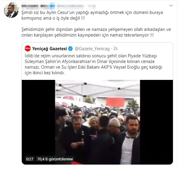 İdlib’de şehit olan kahraman askerimiz Piyade Yüzbaşı Süleyman Şahin’in cenaze törenine katılan İYİ Partili Aylin Cesur’un cemaatin önüne geçerek poz vermesi büyük tepki çekerken partinin gazetesi olarak bilinen Yeniçağ gazetesi skandalı örtmek için yalan haber yaptı. Yeniçağ gazetesi, İYİ Partili Aylin Cesur’u korumak için namaz üzerinden algı operasyonu yaptı. Cenaze namazının AK Partili Veysel Eroğlu nedeniyle ikinci kez kılındığı yalanını söyleyen Yeniçağ gazetesinin manipülasyonu kısa süre içerisinde ortaya çıktı. Namazın ikinci kez kılınmasının sebebinin şehidin geç kalan silah arkadaşları ve kayınpederi olduğu söylendi.
