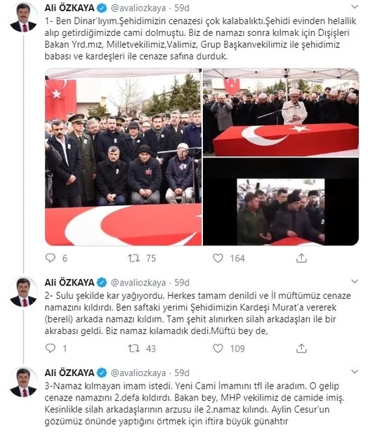 Konuyla ilgili açıklamalarda bulunan AK Parti Afyonkarahisar Milletvekili Ali Özkaya, "Ben Dinar'lıyım.Şehidimizin cenazesi çok kalabalıktı.Şehidi evinden helallik alıp getirdiğimizde cami dolmuştu. Biz de namazı sonra kılmak için Dışişleri Bakan Yrd.mız, Milletvekilimiz,Valimiz, Grup Başkanvekilimiz ile şehidimiz babası ve kardeşleri ile cenaze safına durduk. Sulu şekilde kar yağıyordu. Herkes tamam denildi ve İl müftümüz cenaze namazını kıldırdı. Ben saftaki yerimi Şehidimizin Kardeşi Murat'a vererek (bereli) arkada namazı kıldım. Tam şehit alınırken silah arkadaşları ile bir akrabası geldi. Biz namaz kılamadık dedi. Müftü bey de, Namaz kılmayan imam istedi. Yeni Cami İmamını telefon ile aradım. O gelip cenaze namazını 2.defa kıldırdı. Bakan bey, MHP vekilimiz de camide imiş. Kesinlikle silah arkadaşlarının arzusu ile 2.namaz kılındı. Aylin Cesur'un gözümüz önünde yaptığını örtmek için iftira büyük günahtır" ifadelerini kullandı.