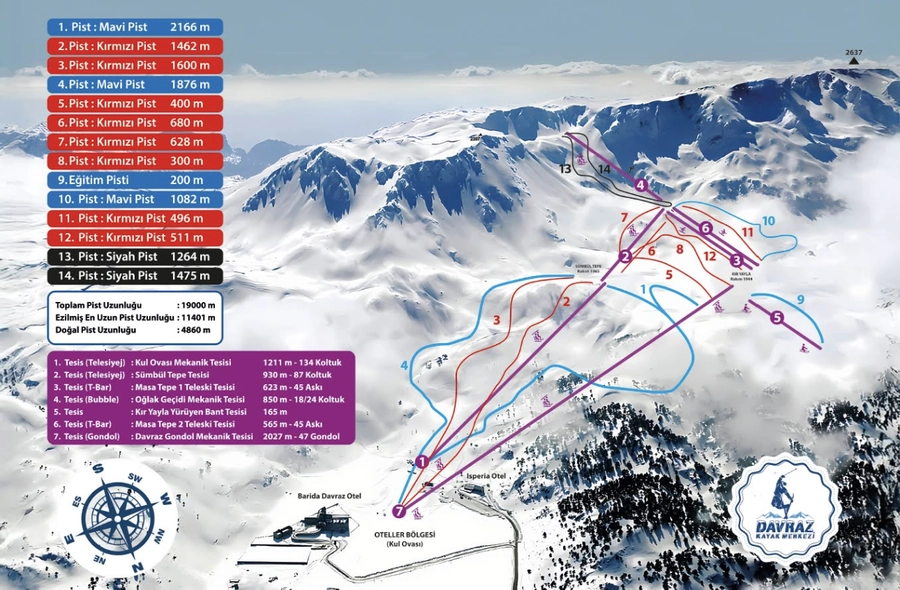 “Oteller bölgesi 1600 metre rakımda yer alıyor. Kayakçılarımızın en yoğun kullandığı alanlardan biri olan Taş Kafe 1900 metrede bulunuyor. Davraz Dağı’nın zirvesi ise 2343 metre rakıma ulaşıyor. Bu yapı, Davraz’ı hem doğa hem de spor açısından eşsiz bir tabiat harikasına dönüştürüyor.”