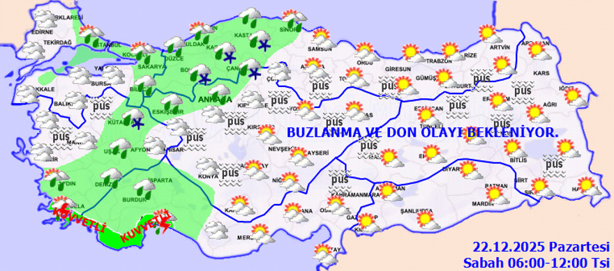 Gece ve sabah saatlerinde kuzey, iç ve doğu kesimlerde şiddetli soğuk, buzlanma ve don ile birlikte pus ve yer yer sis görülecek.
