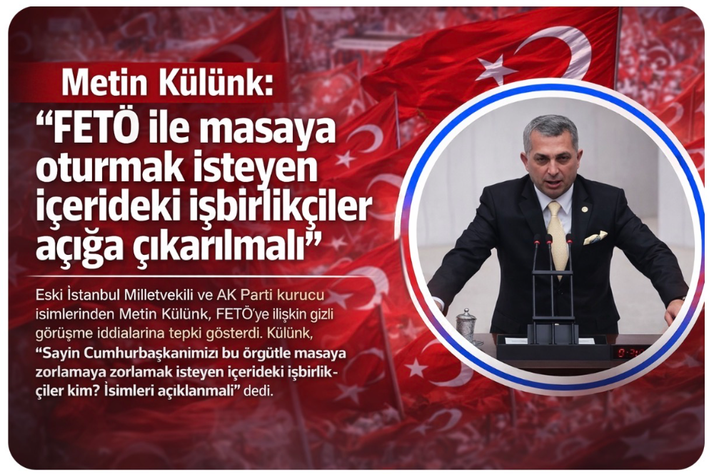Eski İstanbul Milletvekili ve AK Parti kurucu isimlerinden Metin Külünk, sosyal medya hesabından FETÖ ile ilgili iddialara sert tepki gösterdi. Külünk, FETÖ’nün Türkiye’de yeniden zemin bulmasını engellemek için mücadelenin sulandırılmaya çalışıldığını ifade ederek, “Kim bunlar? İsimleri açıklanmalı. Hangi sıfatla, ülkemize ve milletimize kastetmiş bu örgütün kadrolarını yeniden Türkiye’nin başına bela etmek için hareket eden içerideki işbirlikçi unsurlar kimlerdir?” dedi.