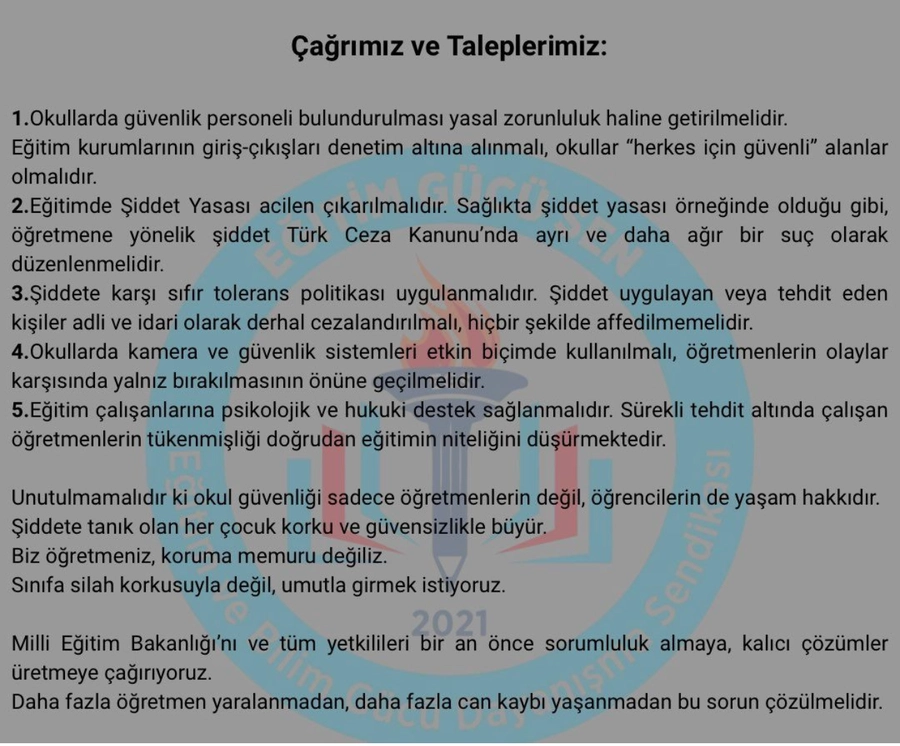 Açıklamanın sonunda, “Eğitim kurumları güvenli hale getirilmeden, nitelikli eğitimden söz edilemez.” denilerek yetkililere çağrıda bulunuldu.