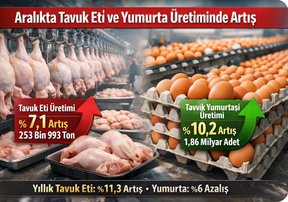 Aralık ayında hem üretim hem kesim sayısında güçlü artışlar kaydedildi. Tavuk eti üretimi yıl genelinde çift haneli büyüme gösterirken, yumurta üretiminde yıllık bazda düşüş yaşanması sektörde arz, ihracat veya maliyet kaynaklı dengelerin etkili olabileceğine işaret ediyor.
