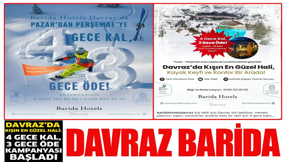 Isparta Barida Hotels Davraz tarafından hayata geçirilen “4 Gece Kal, 3 Gece Öde” kampanyası, hem kayak tutkunlarına hem de konforlu bir kış tatili arayan misafirlere önemli avantajlar sunuyor. İletişim 0246 267 20 40