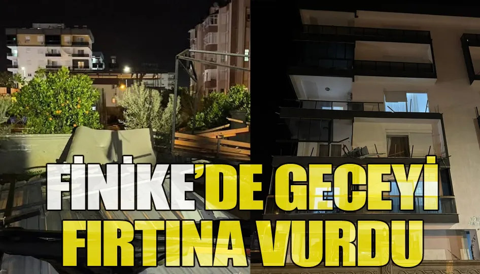 Finike’de geceyi fırtına vurdu Antalya’nın Finike ilçesinde gece saatlerinde etkili olan yağmur ve fırtına seralara ve evlere zarar verdi, bazı binaların çatıları uçarken apartman camları kırıldı.